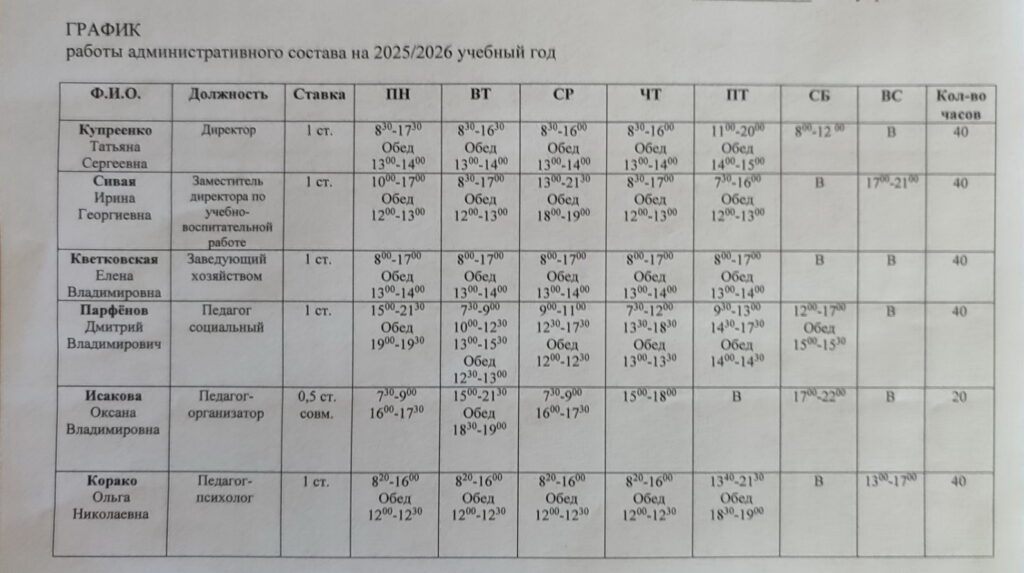 График работы административного состава на 2025/2026учебный год Опубликовано 14.08.2025Обновлено на 09.09.2025от Narziss57Рубрики:Администрация