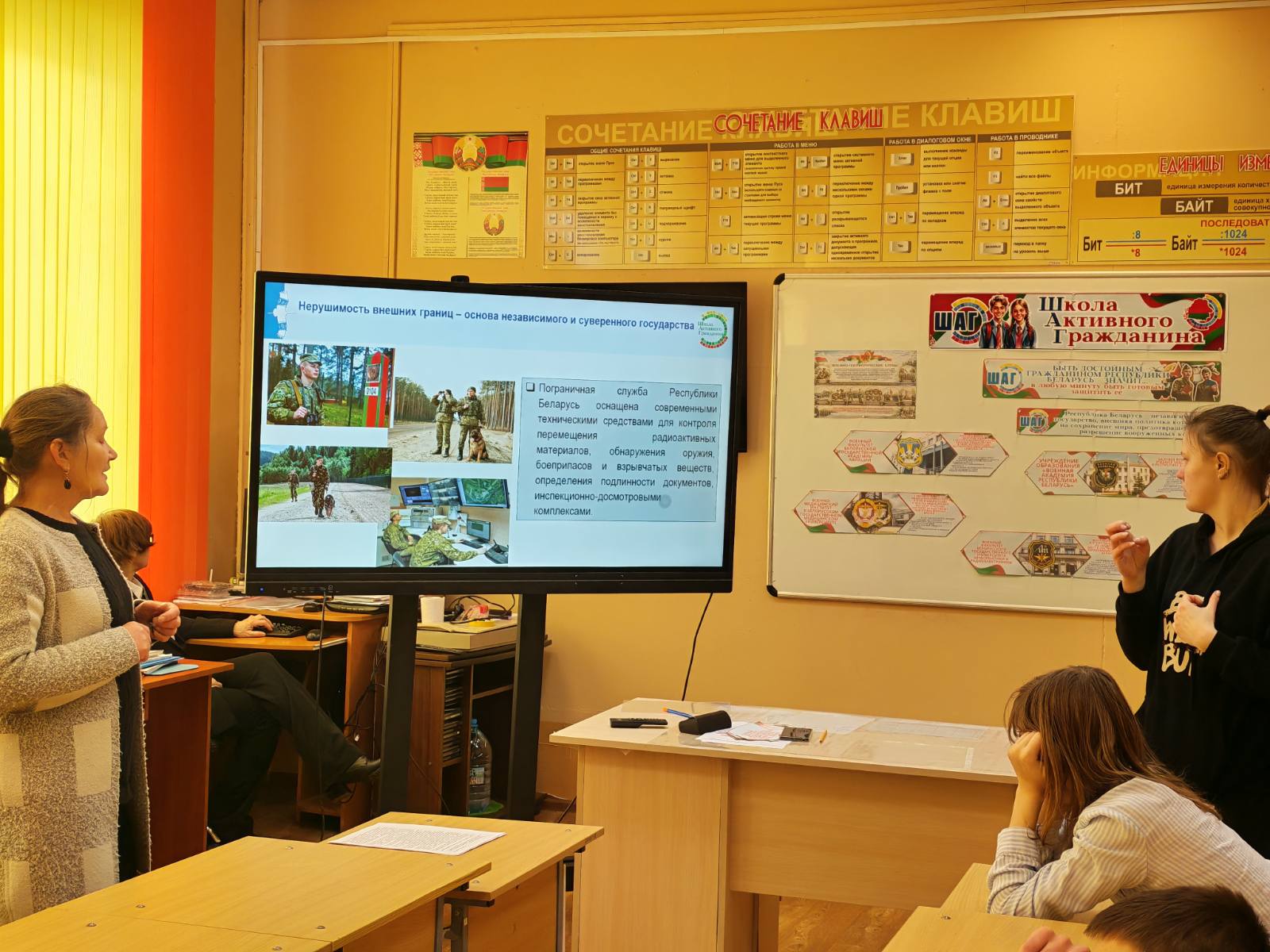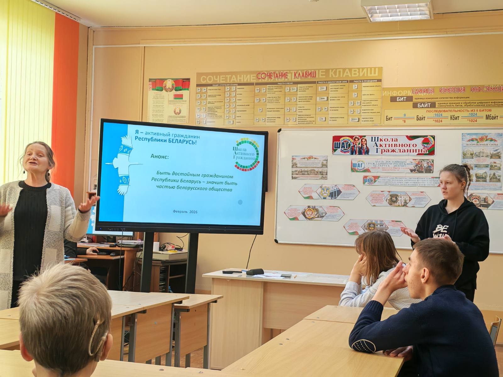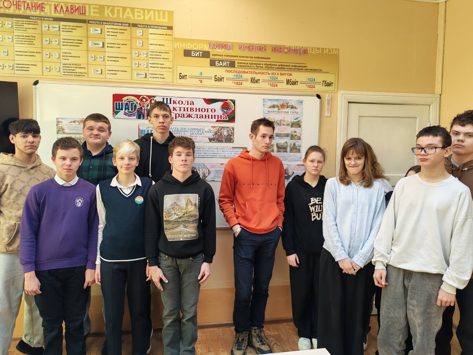 29 января 2026 года в учреждении образования прошёл Единый день информирования для учащихся IX-XII классов в рамках республиканского информационно-образовательного проекта «ШАГ». Январская встреча была посвящена теме: «Быть достойным гражданином Республики Беларусь – значит быть готовым в любую минуту встать на защиту Родины». В центре внимания учащихся 9-12 классов были вопросы сохранения мира как безусловной ценности, роль Вооруженных Сил и система военного образования в стране. Во время встречи ребята поговорили об обороноспособности нашей страны, о Вооружённых Силах Республики Беларусь и их готовности в любую минуту отстоять мир и независимость нашего Отечества. Учащиеся узнали о профессиях, связанных с защитой Родины, и учебных заведениях Республики Беларусь, где можно получить военные специальности.