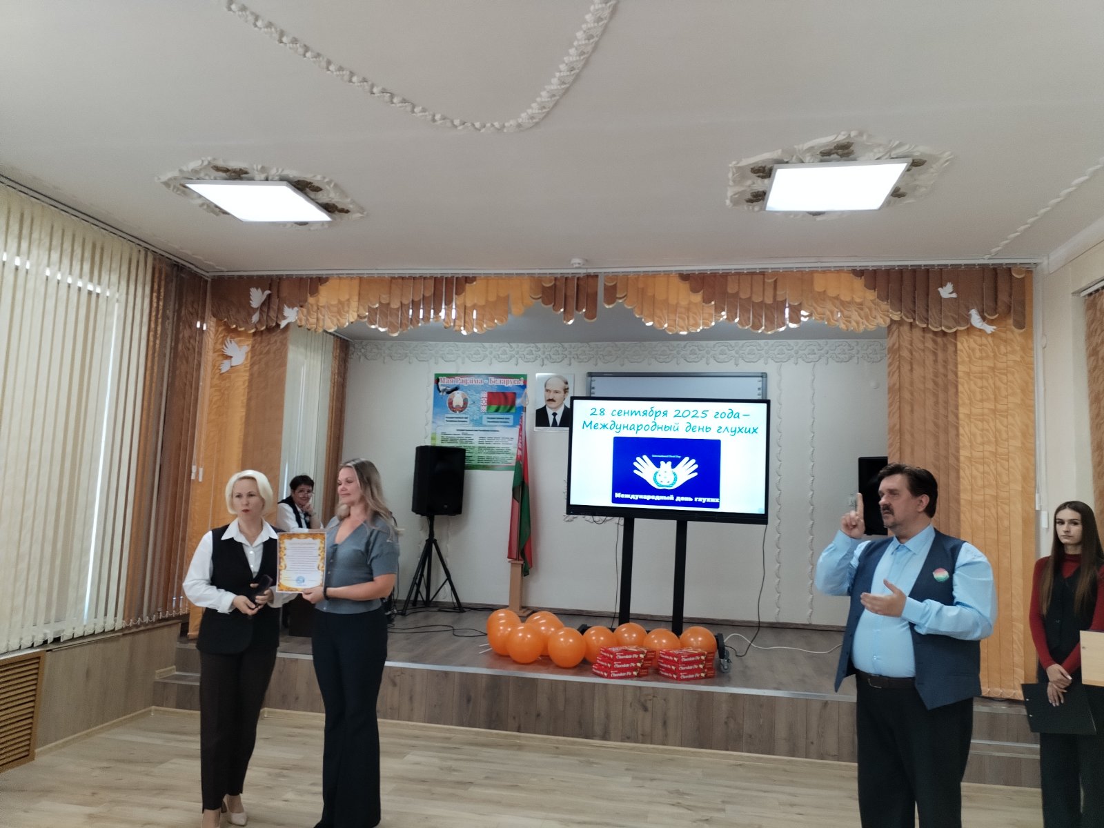 Накануне Международного дня глухих в Речицкой школе-интернате для детей с нарушением слуха прошло мероприятие «Слышать сердцем, говорить руками, достигать — вопреки». Цель которого — напомнить о важности равных возможностей и участия каждого в жизни общества. На мероприятии присутствовали представители Региональной дирекции ОАО «Белагропромбанк», и, конечно же, с подарками. В знак благодарности за внимание ученики школы подготовили творческие подарки — песни и номера на жестовом языке.