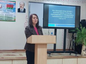 26.10.2023 года на базе государственного учреждения образования «Речицкая специальная школа -интернат для детей с нарушением слуха» состоялся областной семинар по теме «Роль движения в реабилитации детей с нарушением слуха» для специалистов(методистов), курирующих вопросы специального образования, физической культуры и здоровья. Цели семинара: ознакомить участников семинара с реализацией прав детей с нарушением слуха в Гомельской области, транслировать опыт работы по реабилитации детей с нарушением слуха на уроках физической культуры и здоровья, ознакомление с методикой и организацией занятий физической культурой с детьми дошкольного возраста с нарушением слуха, ознакомить с работой «Гомельского областного центра олимпийского резерва по паралимпийских и дефлимпийским видам спорта» с обучающимися с нарушением слуха. Приняли участие в работе семинара 53 специалиста. Перед участниками семинара выступили Корнилов Ю.Г., директор государственного учреждения «Гомельский областной центр физического воспитания и спорта учащихся и студентов», директор государственного учреждения образования «Гомельский областной центр коррекционно-развивающего обучения и реабилитации» Усова Т.М., директор учреждения «Гомельский областной центр олимпийского резерва по паралимпийским и дефлимпийским видам спорта» Кожемяко Д.Д., поделились опытом работы инструктор- методист Атрощенко А В и тренер- преподаватель по спорту Кацуро В.Д.