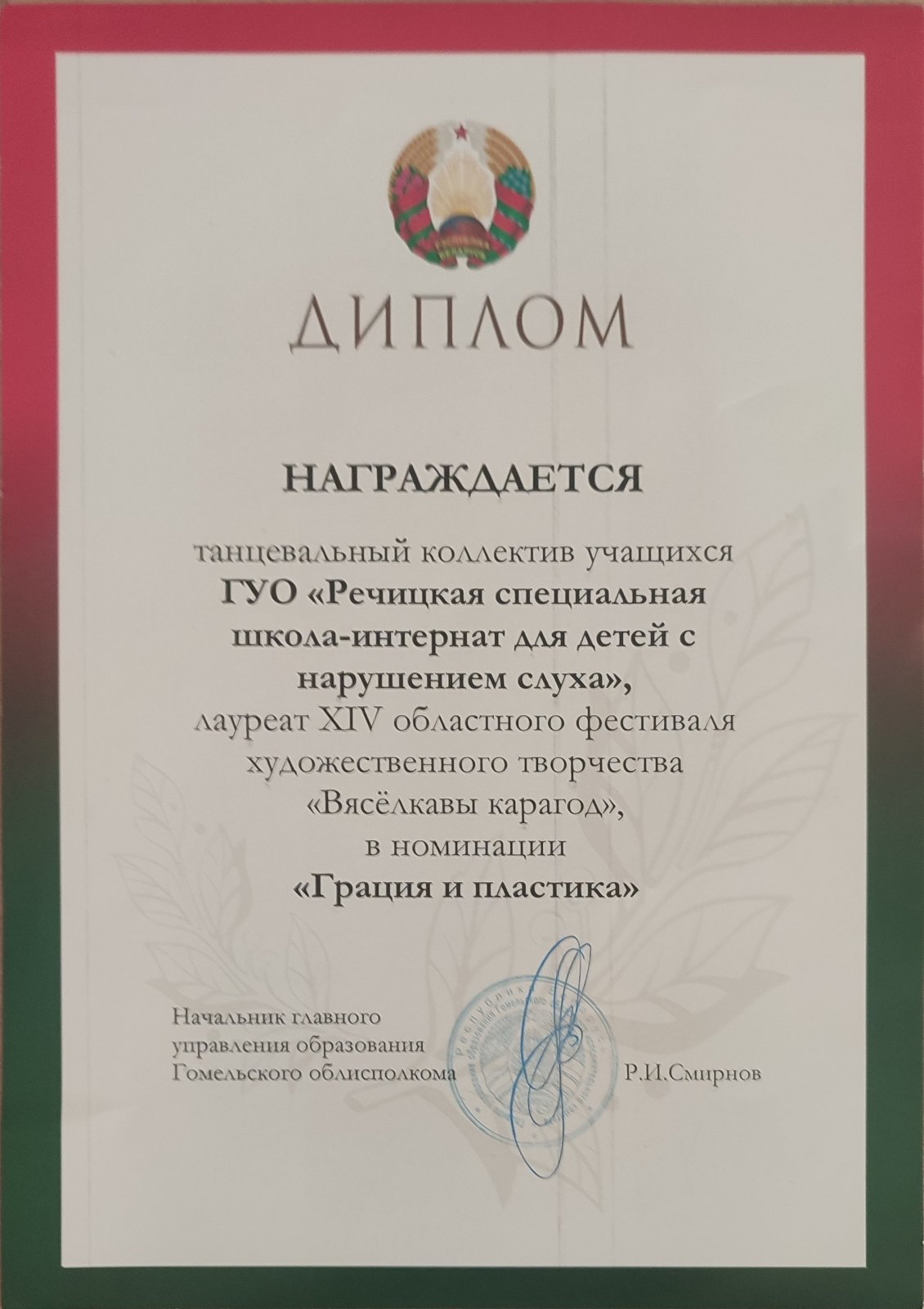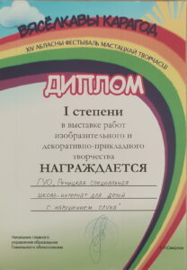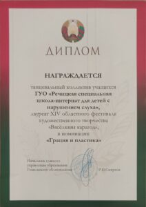 Небольшая, но дружная команда педагогов и учащихся Речицкой школы-интерната приняли участие в областном этапе XlV республиканского фестиваля художественного творчества «Вяселкавы карагод». Представили креативную, уникальную выставку декоративно- прикладного творчества » Имя этой силе есть — Семья» ( диплом I степени). Наши ребята показали своё мастерство в художественной самодеятельности. Они стали победителями в номинации » Грация и пластика».