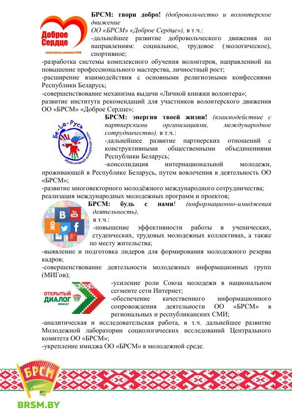 У каждого из нас есть идеи, замыслы, творческие планы. Реализовать их можно со своими единомышленниками. Каждый молодой человек должен иметь возможность быть услышанным, обсудить вопросы, которые его волнуют, с другими заинтересованными людьми (сверстниками, представителями старшего поколения, экспертами, представителями власти), узнать , что он может сделать для решения существующих проблем, а также получить поддержку своих дальнейших действий. БРСМ по настоящему единый молодежный союз. Работая в нем, мы выступаем не только как жители своего города, учащиеся своей школы, но и как представители белорусской молодежи. Мы ощущаем себя частью нашей Родины, частью Республики Беларусь.
